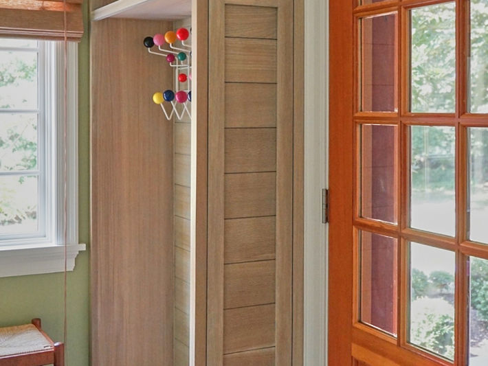 Contain the mess in style in a small Mudroom. Custom Millwork with Eames Hang It All Hooks.